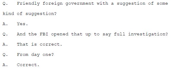 Durham also asks about Crossfire Hurricane, his questions critical of the FBI’s opening of a “full investigation” based on “suggestions of some kind of suggestion” (the George Papadopoulos allegations):