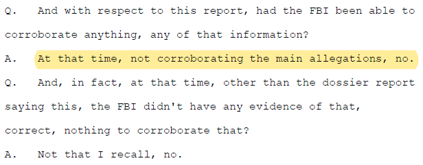 Q: And between September 19th of 2016 and October 21st, when the FBI submitted the FISA application, were you able to confirm or corroborate in any of the FBI system the very serious allegations that were contained in the dossier reports?