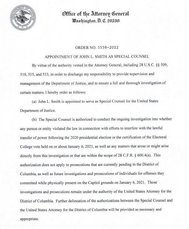 The scope of Smith’s appointment includes January 6 and the ongoing classified/national security documents investigation. As to January 6, Smith is tasked to “conduct the ongoing investigation into
