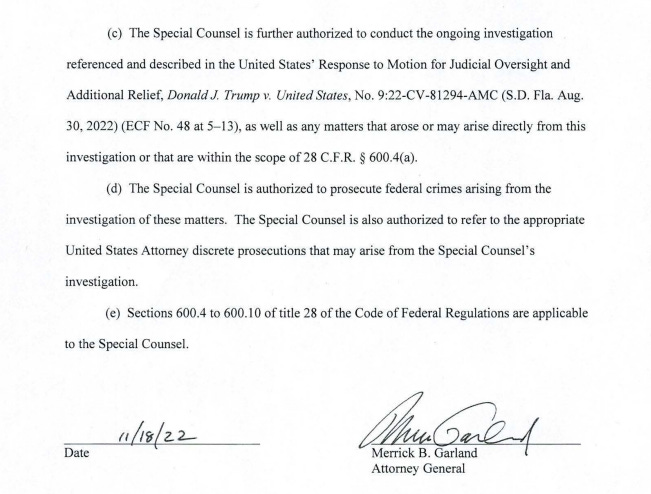 With respect to the Mar-a-Lago raid, Smith “is further authorized to conduct that investigation . . . and any matters that arise or may arise directly from that investigation.”