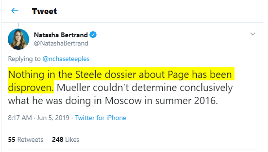 Natasha Bertrand was perhaps the most notoriously wrong reporter during the Trump-Russia hysteria. She spread the lies of the US intelligence community through various national platforms (Business Insider, The Atlantic, Politico, etc.): that the Steele Dossier had been corroborated, that the Horowitz probe would be of questionable quality, that it was “much more plausible that Trump did go to Russia and he did have these kinds of sexual escapades with prostitutes.”