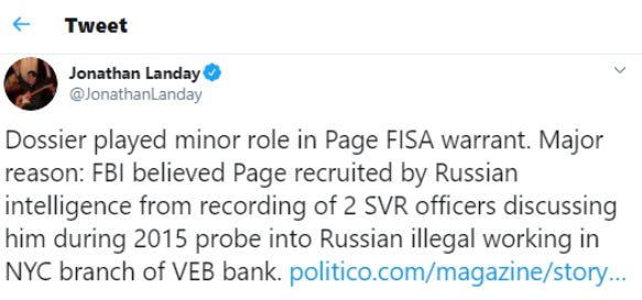 Reuters DC National Security Correspondent Jonathan Landay made a similar argument, saying the “Dossier played minor role in Page FISA warrant.”