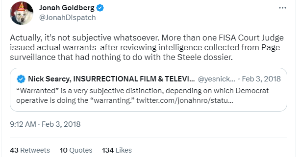 Jonah Goldberg, without knowledge of the Page applications or the evidence collected by the FBI, offered insight into the actions of “more than one FISA Court Judge” and the “intelligence collected from Page surveillance that had nothing to do with the Steel dossier.” In fact, as Durham’s report proves, the “Page surveillance” revealed no such intelligence. One FBI Agent told Durham’s team that they targeted Page “in the hope that the returns would ‘self-corroborate.’”