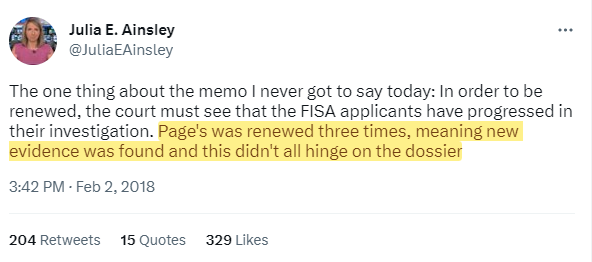Ken Dilanian at NBC News would report in July 2018: “The so-called dossier formed only a smart part of the evidence used to meet the legal burden of establishing ‘probable cause’ that Page was an agent of Russia.” His NBC news comrade, Julia Ainsley, would also say that the Page FISAs “didn’t all hinge on the dossier.” She even stated “new evidence was found” against Page.