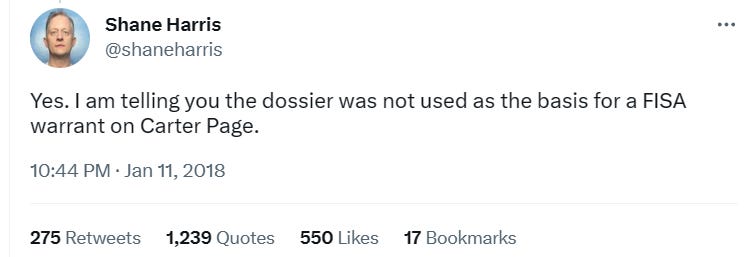 Shane Harris of The Washington Post said “the dossier was not used as the basis for a FISA warrant on Carter Page.” He hadn’t seen the FISA warrant, but that didn’t stop him from making guarantees about its contents.