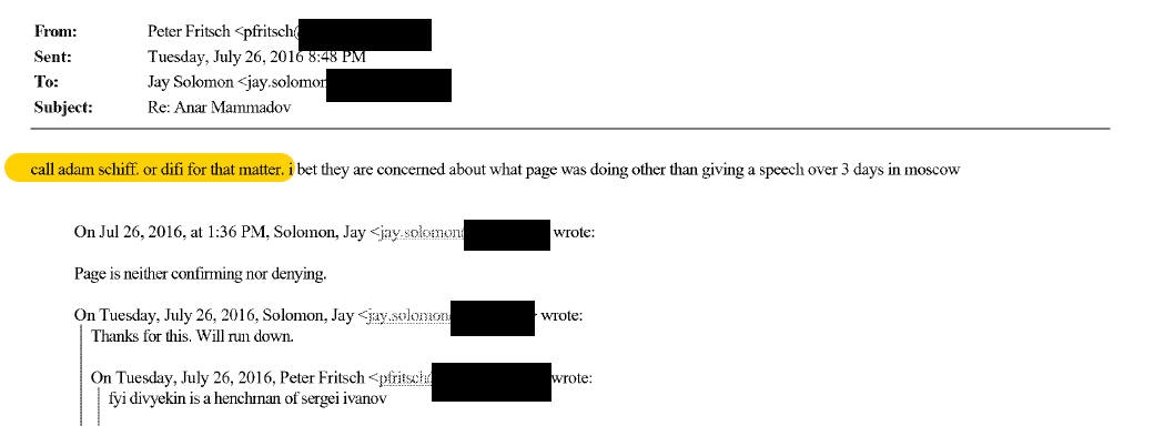 And here is Fusion GPS telling a WSJ reporter to call Adam Schiff or Diane Feinstein about Carter Page. This is solid evidence that Fusion GPS, by July 26, 2016, had briefed Schiff and Feinstein (and their staffers - including Daniel Jones, a person of interest in the Durham investigation) about their Trump/Russia “research.”