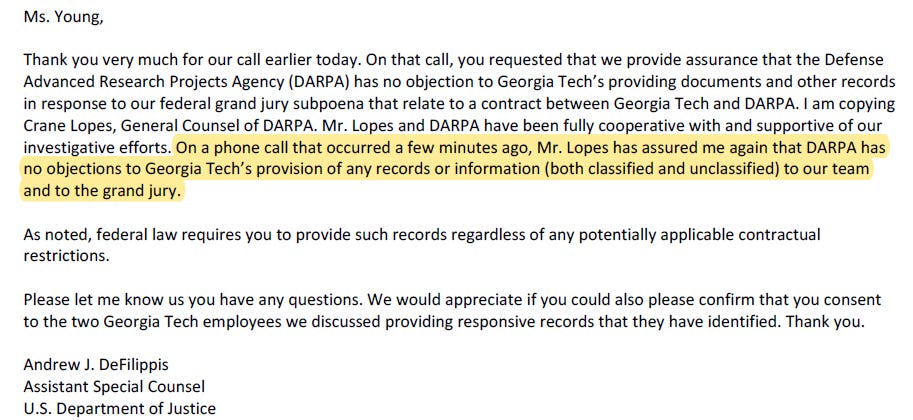 Take a look at this e-mail (obtained by Twitter sleuth UndeadFOIA) where Andrew DeFelippis, who is part of Special Counsel Durham’s team, states that “DARPA has no objections to Georgia Tech’s provision of any records or information (both classified and unclassified) to our team and to the grand jury.”