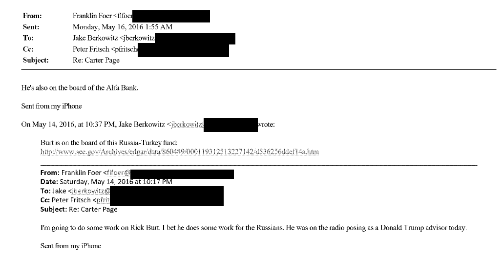 Here are e-mails between Franklin Foer and Fusion GPS, in which they discuss going after Carter Page in May 2016.
