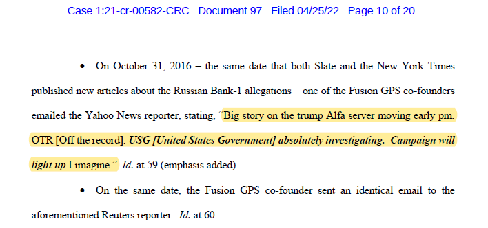 This e-mail from a Fusion GPS co-founder to the New York Times - dated October 31, 2016 - pushing the Alfa Bank allegations and stating the US Government is investigating.