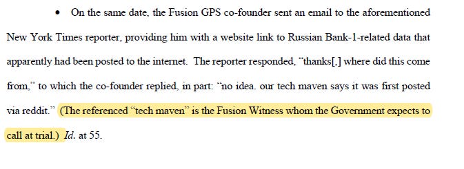 There are a number of other important observations. The Fusion GPS witness who will testify is the “tech maven” referenced in their e-mails with the New York Times. This appears to be confirmation that Laura Seago will be the Fusion GPS employee to testify.