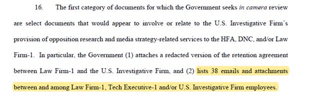 Additionally, Durham casts doubt on the declaration of Marc Elias that Fusion GPS was retained to provide “legal advice.” Here he makes a key point: