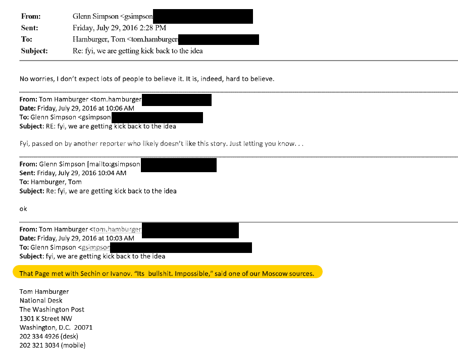 July 29 and July 31, 2016 emails with a reporter (Washington Post’s Tom Hamburger) concerning Carter Page’s investments and meetings with Russians - of which the reporter said “Its bullshit.”