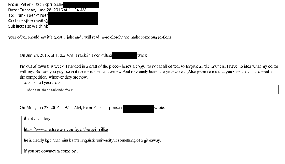 Fusion GPS and Franklin Foer (then-working with Slate, and now with The Atlantic) e-mails - in which Fusion GPS alleges Millian is “clearly KGB.” Take a close look at Foer’s interactions with Fusion GPS. This is the press you don’t see: groveling to opposition researchers, begging for their assistance with “omissions and errors,” and pleading that his draft not be distributed to the competition. In other words, entirely consistent with the journalistic standards of Slate.