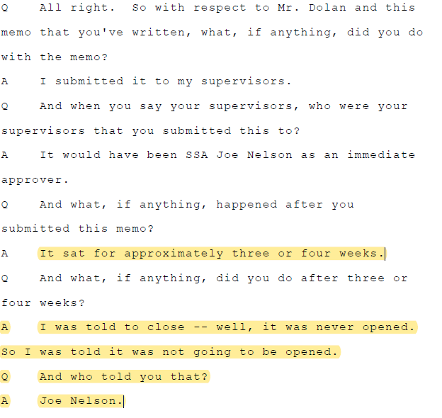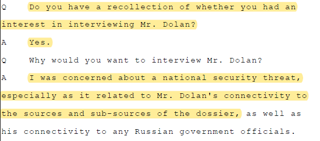 FBI Special Agent Amy Anderson, also part of the Mueller Special Counsel, requested to interview Dolan. Her request was shut down by superiors.