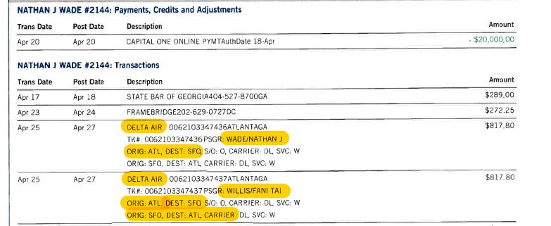 April 25, 2023: Nathan Wade purchases Delta Airlines tickets for himself and Fani Willis. As part of this trip, they apparently traveled to Napa Valley and stayed at the Doubletree hotel.