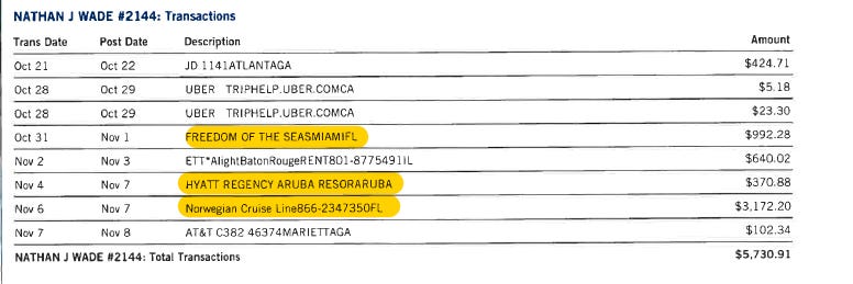 Special Prosecutor Nathan Wade has, according to his credit card statements, taken trips to San Francisco and Napa Valley, Florida, gone on a Caribbean cruise, Australia, Panama, and Belize. These trips all took place after he filed for divorce. And Willis – the boss of Nathan Wade, the woman who enriched him by appointing him as Special Prosecutor – joined Wade some of (if not all) of these trips.