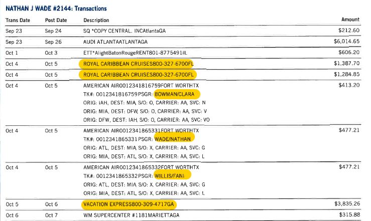 October 2022: Two reservations for Royal Caribbean Cruises and three American Airlines tickets to Miami for Nathan Wade, Fani Willis, and Clara Bowman (identified as Wade’s mother).