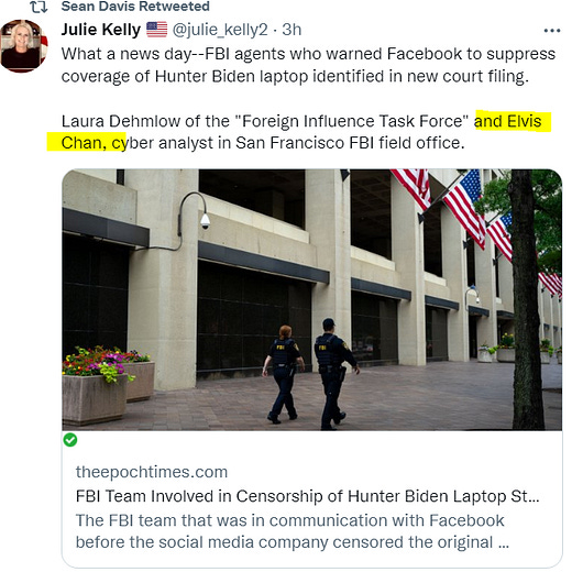 The importance of SSA Chan shouldn’t be understated. He was at the front-lines of the FBI’s efforts to curb speech on social media during the 2020 election. It was Chan who has been reported to have had “weekly meetings with major social media companies to warn against Russian disinformation attempts ahead of the 2020 election.”