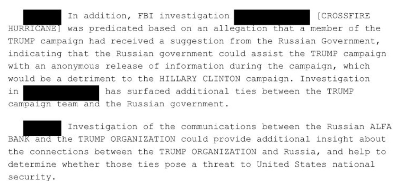 And on that thread, what are the odds that another Clinton ally - Alexander Downer - took his “info” to the FBI? Downer’s tip was referenced in the opening of the Alfa Bank-Trump investigation, seen below. (Note that the FBI misrepresents both the Downer tip and Mifsud’s purported statement to George Papadopolous.)