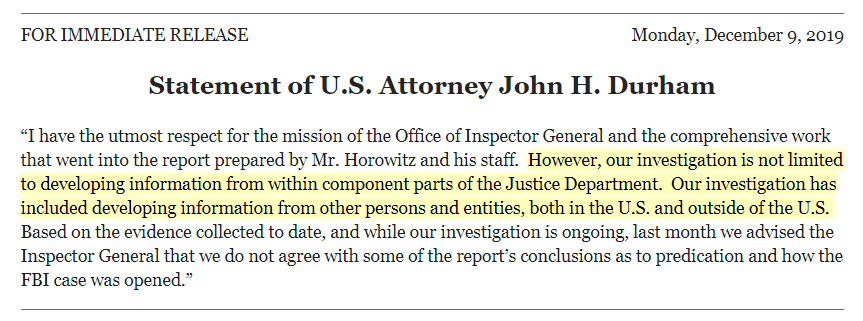Of course, if you’ve been following along, this isn’t breaking news. There is months-old reporting on Durham’s use of grand juries and Durham isn’t just “now arranging witness interviews.” As then-U.S. Attorney Durham stated in a December 9, 2019 press release response disputing IG Horowitz’s opinions on the predication of Crossfire Hurricane, he had already developed “information from other persons and entities, both in the U.S. and outside of the U.S.”: