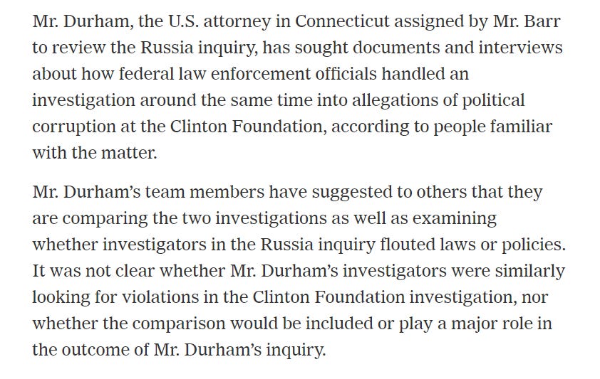 In September 2020, Adam Goldman (and others) at the New York Times broke a story that Durham (just prior to appointment as special counsel) was looking into how federal law enforcement officials handled the investigation of allegations “of political corruption at the Clinton Foundation.”