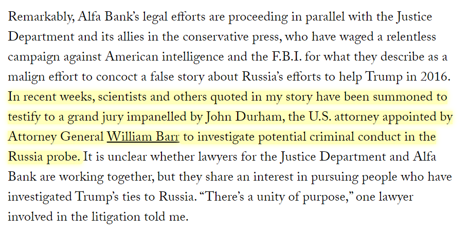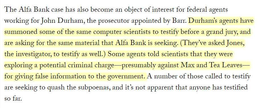 Later last fall, on October 7, 2020, Dexter Filkins with The New Yorker reported that Durham had summoned to testify to a grand jury “scientists and others” quoted in his story on the origins and investigation of communications between the Trump Organization and Alfa Bank (Russia).