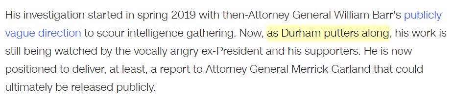 This is a term typically reserved for people not doing much of anything. It becomes a derisive term when reporters use it to describe the Special Counsel. And it’s inaccurate when (1) you admit you’re ultimately clueless about Durham’s progress and (2) you cite sources who reference progress like grand jury subpoenas and interviews.
