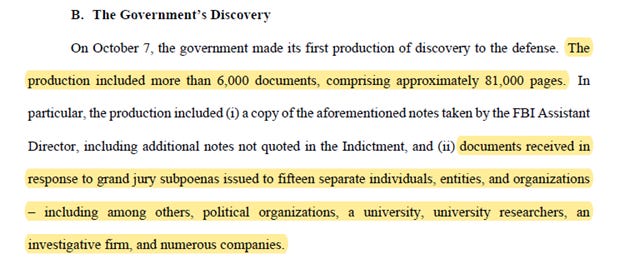 What’s really notable about the motion is that Durham discloses the volumes of evidence to be produced to Sussmann and the number of entities and people Durham has subpoenaed.