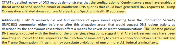 This theory of manipulating the data is consistent with the communications revealed in the Sussmann indictment, where a member of the Alfa Bank “research” team explained that it would be possible to: