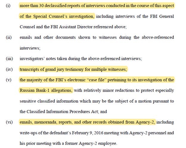 And that’s just on the Alfa Bank issue. (Durham apparently remains focused on the broader FISA issues as well as other matters.) The filing also notes that Durham is “working expeditiously to declassify large volumes of materials to provide to the defense.” This includes: