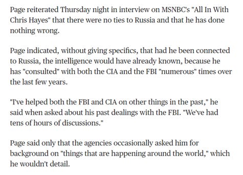 Clinesmith’s assignment was particularly important. Before the submission of the third FISA renewal (which was ultimately filed on June 29, 2017), Page publicly stated on May 11, 2017 on MSNBC that he had “helped both the FBI and the CIA” in the past.