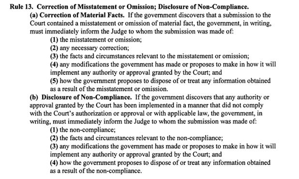The necessity of these rules goes to the nature of the FISA Court. It is a secret court in which the government does not face an adverse party. This creates a “heightened duty of candor” so a Judge can be fully informed on his probable cause findings and to “provide an external check on executive branch decisions to conduct surveillance in order to protect the fourth amendment rights of U.S. persons.”