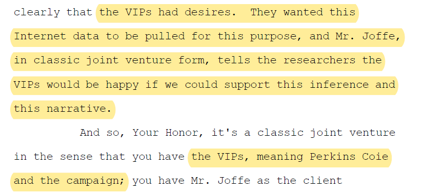 Finally, this statement from the Special Counsel relating to how “the VIPs, meaning Perkins Coie and the [Clinton] campaign” wanted the “Internet data” to be pulled for purposes of digging up information to damage Trump.