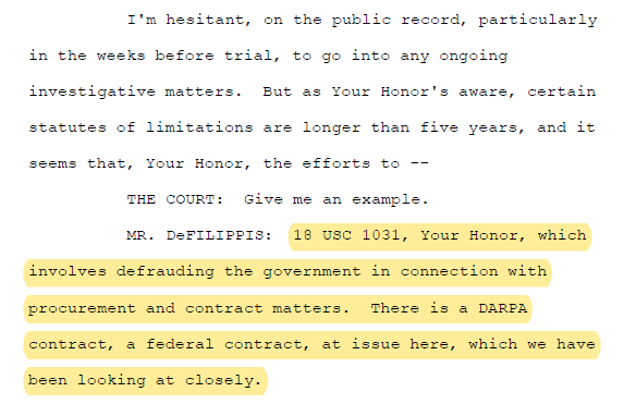 The court asked for an example, and the Special Counsel referenced 18 U.S.C. 1031, “which involves defrauding the government in connection with procurement and contract matters.” This has to do with the Georgia Tech/DARPA contract. In the Special Counsel’s own words: