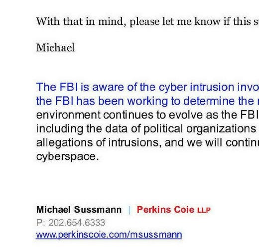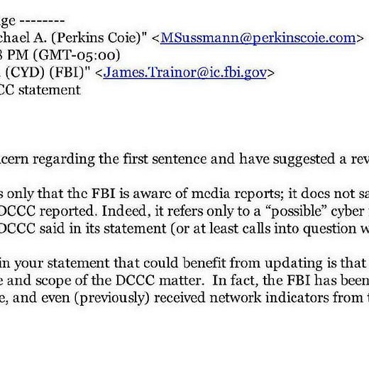 Then there are the trial exhibits, which The Epoch Times has posted here. As Aaron Maté observed, Sussmann edited an FBI press release on the DNC hacking because the FBI’s proposed statement “undermines” the DNC hacking narrative: