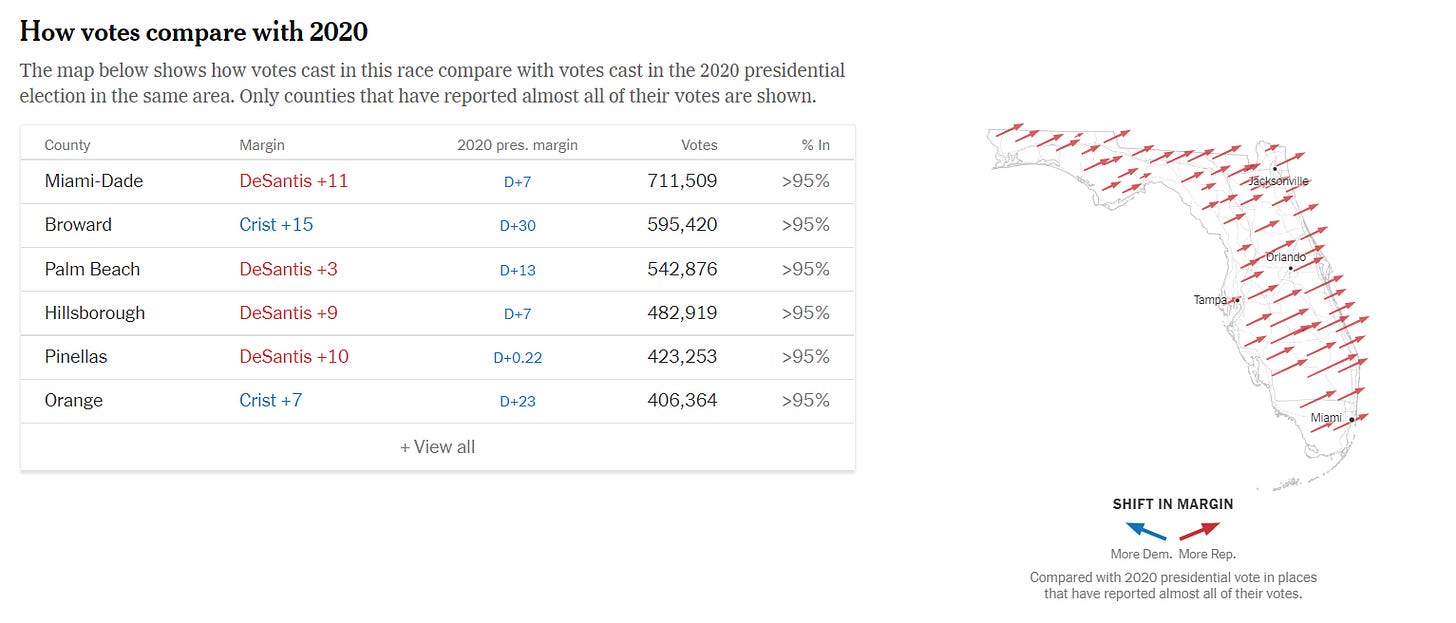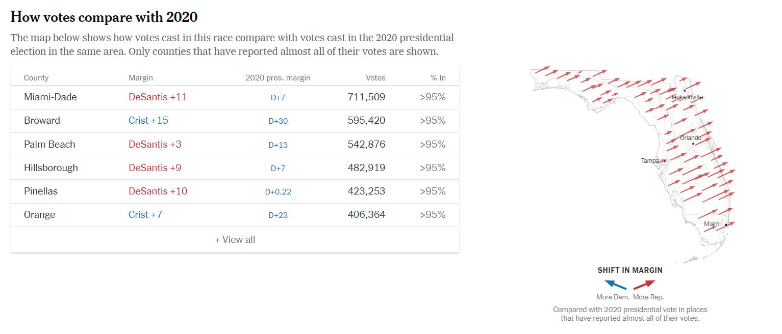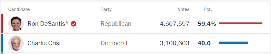 Finally, you can’t discuss 2024 without thinking of the brightest spot for Republicans in the 2022 midterms: the decisive DeSantis win in Florida. Miami-Dade County, which had been solid blue and voted +7 for Biden in 2020, turned DeSantis +11 in 2022. The red shift in Florida was complete.