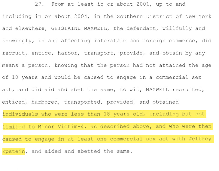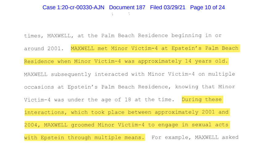 Today the US Government filed a superseding indictment against Ghislaine Maxwell, alleging an additional minor victim (Minor Victim-4) who was allegedly subject to a sex trafficking conspiracy between 2001 and 2004.
