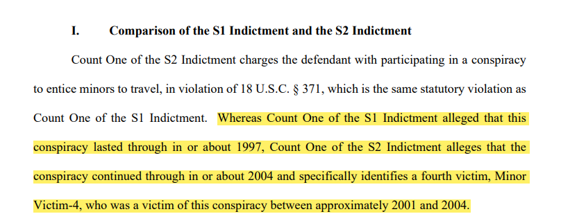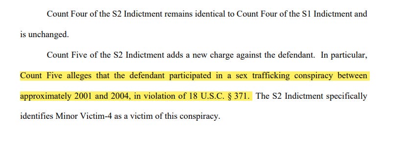 The new indictment also adds a new charge - a “sex trafficking conspiracy” - between 2001 and 2004, in which Minor Victim-4 was “a victim of this conspiracy.”
