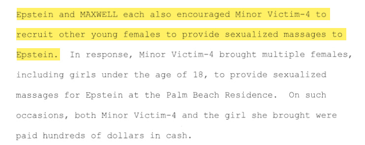 Maxwell and Epstein’s other “conspirators” sent the minor lingerie and gifts. Epstein and Maxwell encouraged the minor to “recruit other young females to provide sexualized massages to Epstein.” These efforts were successful - they found more victims.