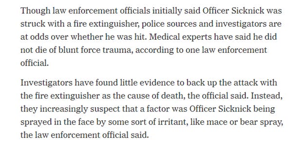 The New York Times’ “law enforcement officials” – whoever they might be – were wrong. While the New York Times tweet and reporting still claim he was killed by Trump supporters, later New York Times reporting from February 11, 2021 states that a contributing factor to his death may have been chemical irritants like mace or bear spray: