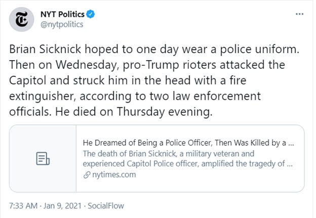 The January 7, 2021 death of Officer Brian Sicknick was initially reported by the New York Times as being caused by pro-Trump rioters, who “struck him in the head with a fire extinguisher.”
