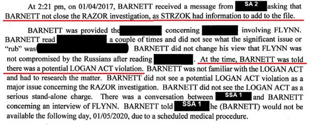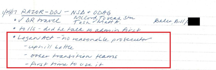 The FBI and DOJ knew that this was improper. January 25, 2017 notes from an FBI OGC lawyer indicated “no reasonable prosecutor” would proceed with the Logan Act. It would be an “uphill battle”; there was the culpability of “other transition teams.”