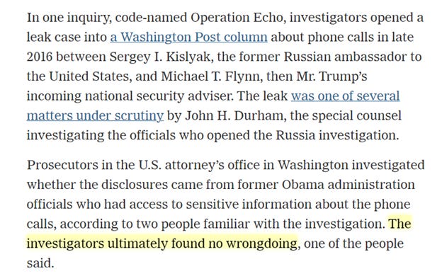 On January 19, 2021, the New York Times reported that investigators had closed the investigation into the Flynn-Kislyak leak (dubbed “Operation Echo”). It was said that the US Attorney’s office in DC investigated whether the disclosures came from “former Obama administration officials who had access to sensitive information about the phone calls.” The investigators “ultimately found no wrongdoing.”