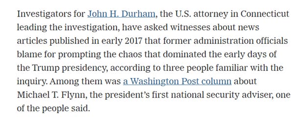 According to the New York Times, the Flynn-Kislyak leak investigation was later overseen by John Durham, before his appointment as Special Counsel.