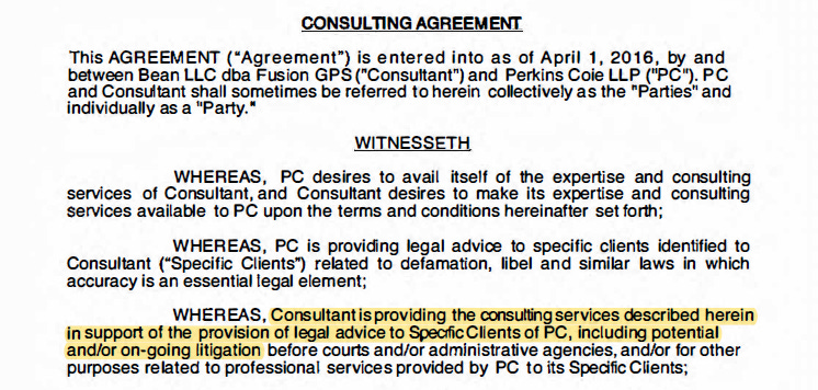 The protects afforded by the work-product doctrine are the very reason why Perkins Coie referenced “potential and/or on-going litigation” in its contract with Fusion GPS. In other words, they planned ahead for the possibility that this privilege might need to be asserted. (This is the privilege Fusion GPS was asserting when it was sued by the owners of Alfa Bank.)