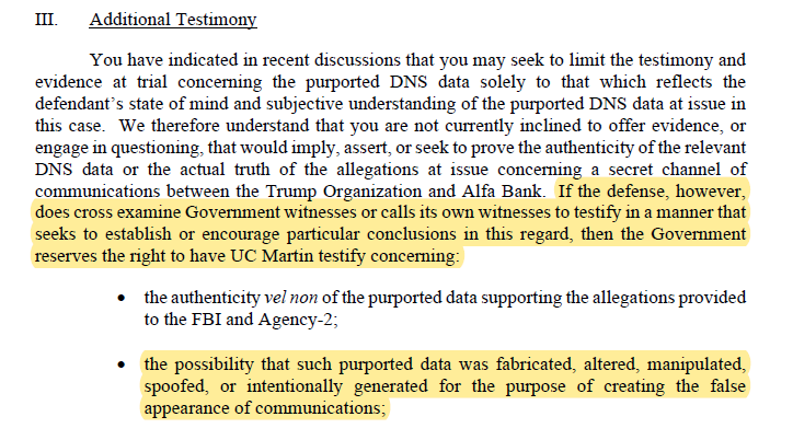 That letter addresses the Special Counsel’s understanding that Sussmann’s lawyers would not “offer evidence, or engage in questioning, that would imply, assert, or seek to prove the authenticity of the relevant DNS data or the actual truth of the allegations at issue concerning a secret channel of communications between the Trump Organization and Alfa Bank.”