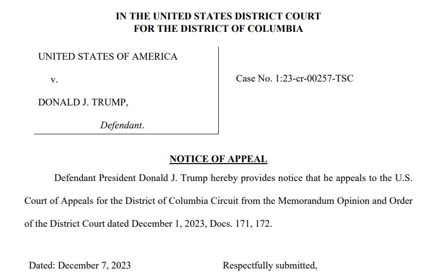 On December 7, 2023, Trump’s team filed their Notice of Appeal concerning Chutkan’s denials.