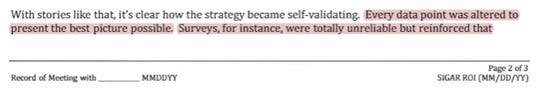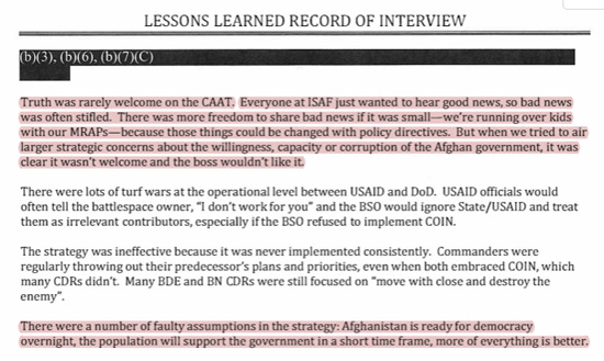 There’s no mistake these lies were political. But the intent was also self-preservation, bubbling up from the need to hide their own failures so they could escape accountability. They knew that the truth about the corruption and lack of progress would cause public outrage and lead to demands of withdrawal. By the deception they denied the American people, through (or from) their elected representatives, their political right to make an informed decision on whether to continue the war in Afghanistan.