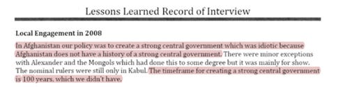 “In Afghanistan our policy was to create a strong central government which was idiotic because Afghanistan does not have a history of a strong central government. . . The timeframe for creating a strong central government is 100 years, which we didn’t have.”