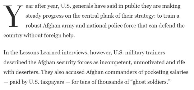 While US Generals said they were making steady progress with training the Afghan army and national police force, “US military trainers described the Afghan security forces as incompetent, unmotivated and rife with deserters.”